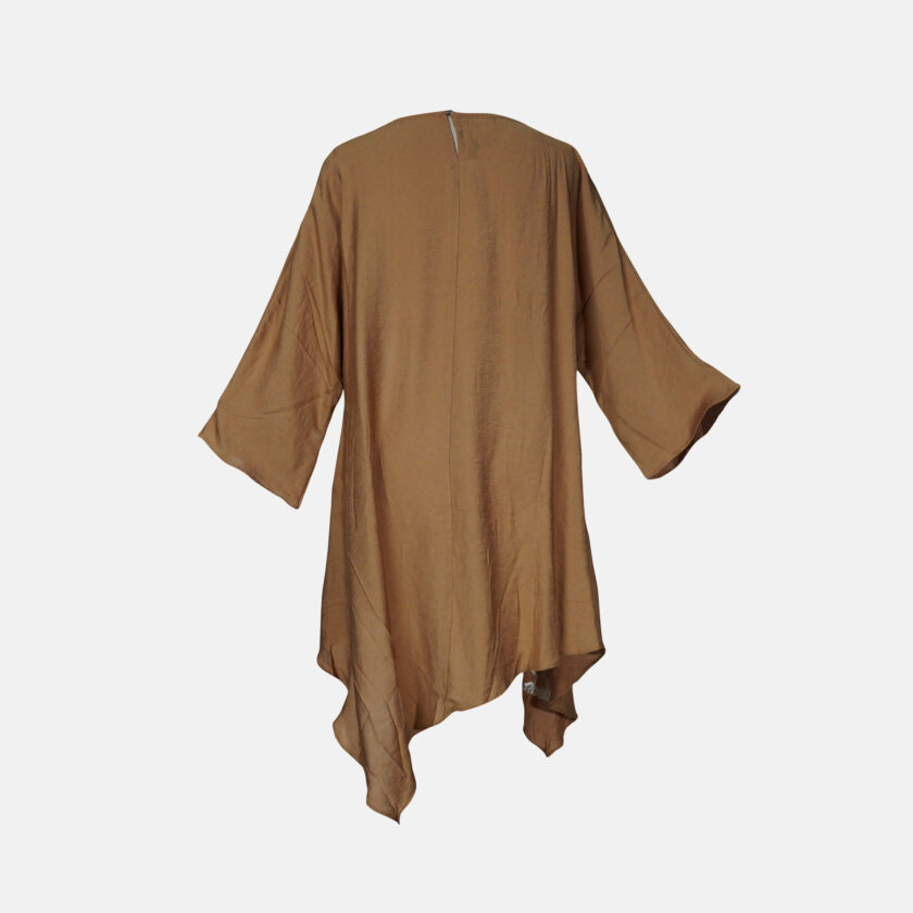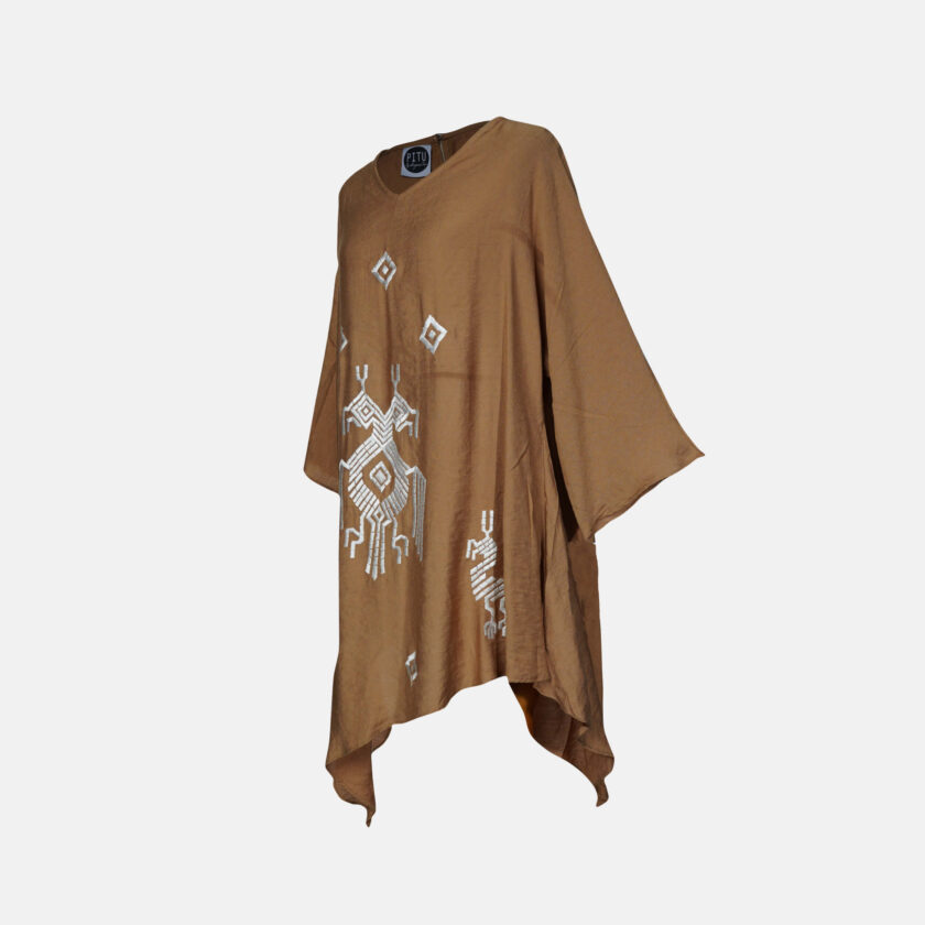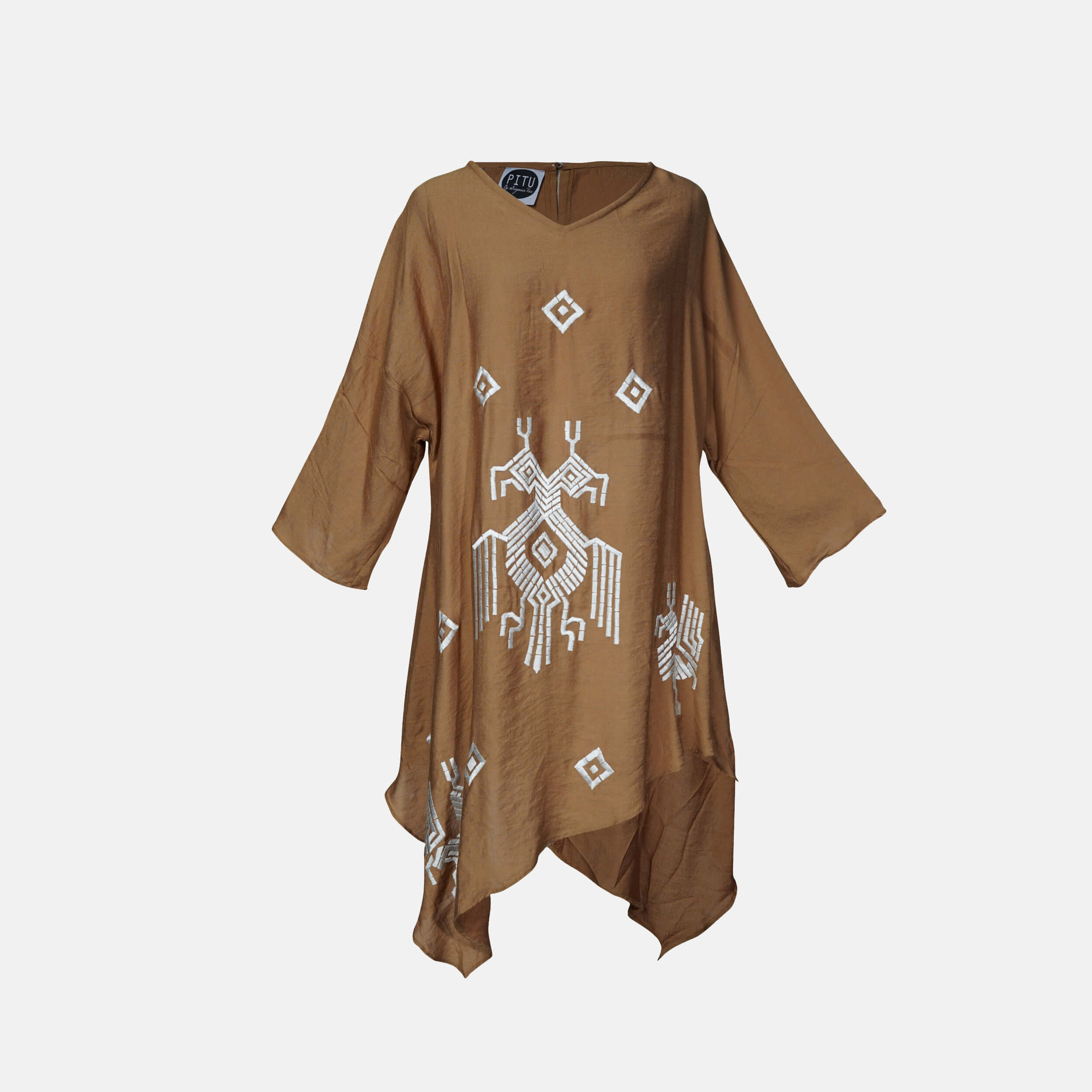 Blouse asimetris berwarna coklat dengan hiasan bordir tenun yang unik semakin mempercantik tampilan pakaian ini. Berbahan lembut dan sangat nyaman digunakan.